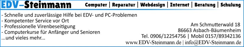Willkommen auf der Website von EDV-Steinmann! Ihr kompetenter Computerservice zu fairen Konditionen.